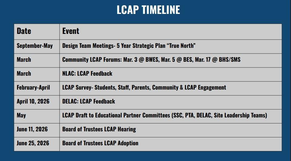 You are invited to contribute your input! The BUSD Board of Education and District Leadership are committed to ensuring our resources are used to meet all students’ needs. Our Local Control and Accountability Plan (LCAP) addresses the district’s vision for student learning, outlines actions and annual goals, and demonstrates how the budget supports these goals. Please join us to share your input and help us evaluate our offerings to inform decision-making for our 2026 LCAP. You are invited to attend any session that is convenient for you.